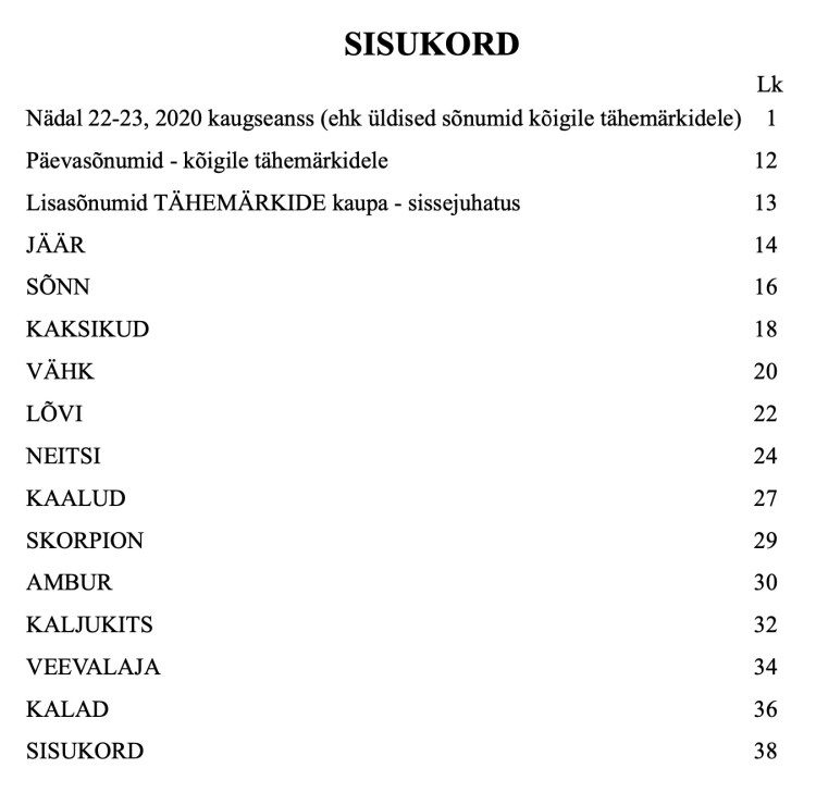 Kui pikk on iga tähemärgi sõnum siin, esimese etapi horoskoobis? Selle näete ära sisukorrast, mille lisan siia alljärgnevalt:
