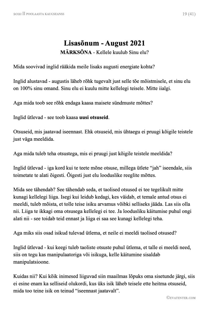 Kui soovite lugeda selle kaugseansi sõnumeid tervikuna, siis leiate kogu lisainfo nende tellimiseks siit – https://evatenter.com/2021/07/01/2021-ii-poolaasta-kaugseanss-juuli-detsember/
