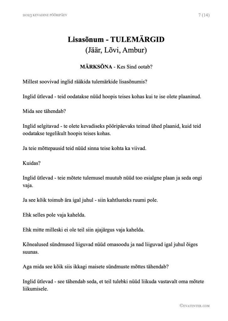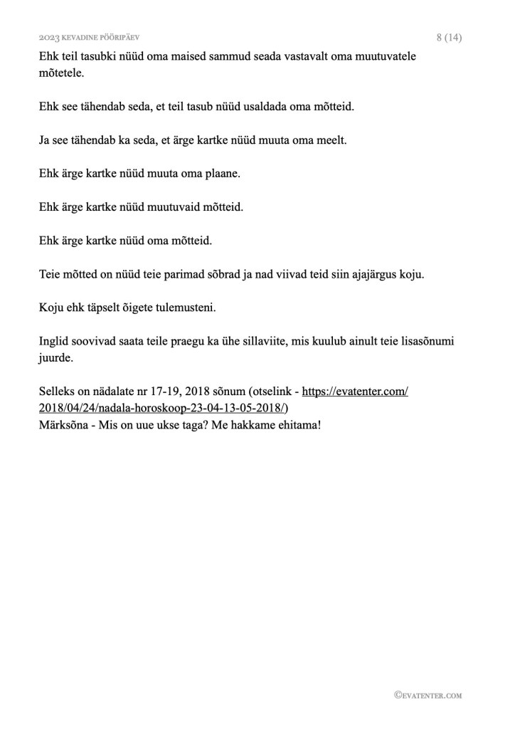 Kui soovite lugeda 2023 kevadise pööripäeva kaugseansi sõnumeid tervikuna, siis nende ostmiseks leiate kogu lisainfo siit – https://evatenter.com/2023/03/13/kaugseanss-kevadine-pooripaev-2023/