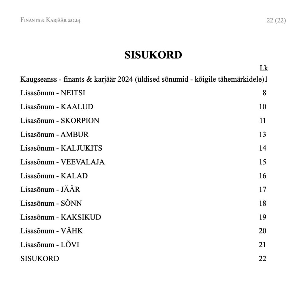 (Antud hind sisaldab seega e-raamatu ehk pdf faili kujul 2024 a. finants & karjäär horoskoopi. Fail/ horoskoop on kokku 22 lk.)