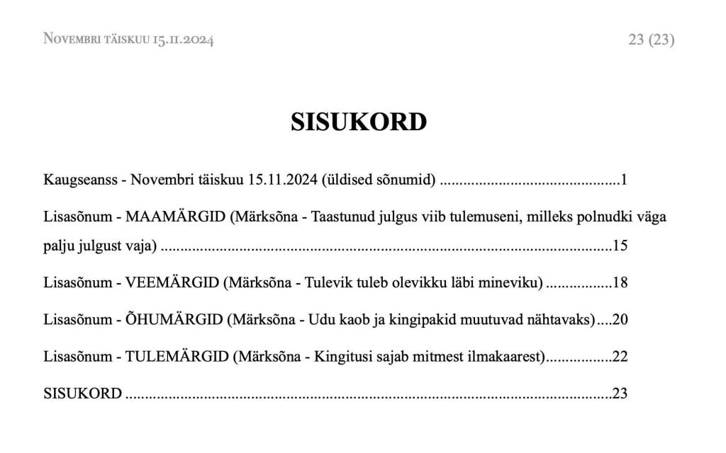 Selle horoskoobi sisu täpse ülesehituse näete ära ka sisukorrast ja nüüd on ka lisasõnumite märksõnad näha otse sisukorrast: