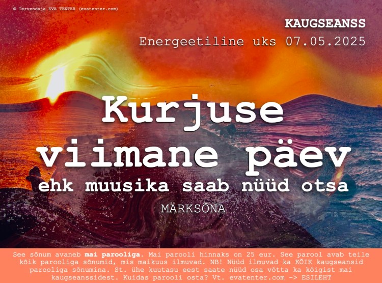 Hetkesõnum 07.05.2025 MÄRKSÕNA – Kes leidis kelle? Millest soovivad inglid rääkida siin hetkesõnumis? Inglid ütlevad – täna suuname me teid üle lugema Kalade 2023 aastasõnumit. Selle sõnumi leiate siit – https://evatenter.com/2022/08/31/horoskoop-2023-kalad/ Aga miks suuname teid täna just selle sõnumi juurde? Inglid ütlevad – sest te leiate täna üles enda uue asukoha. Ehk te leiate täna üles […]